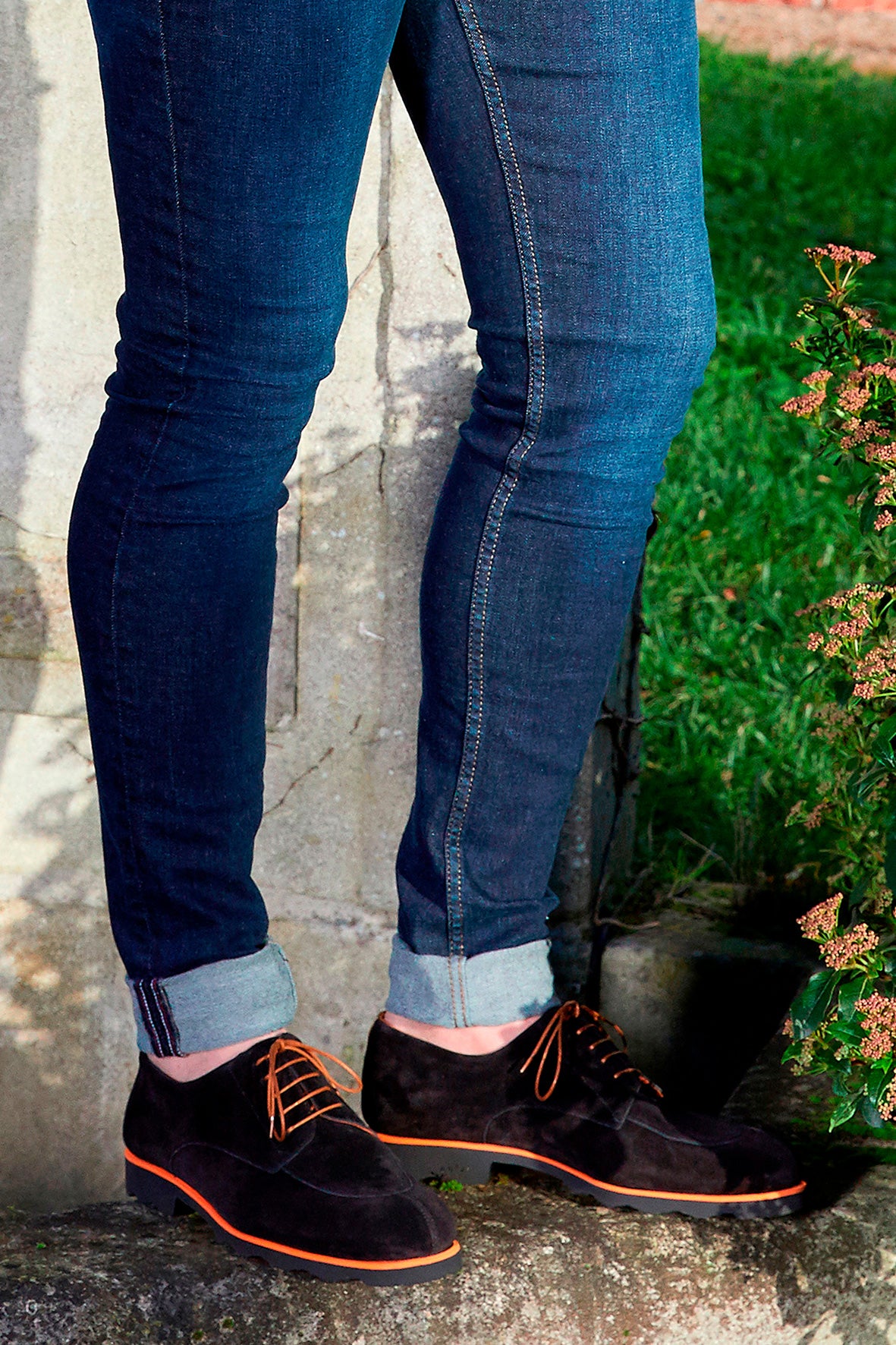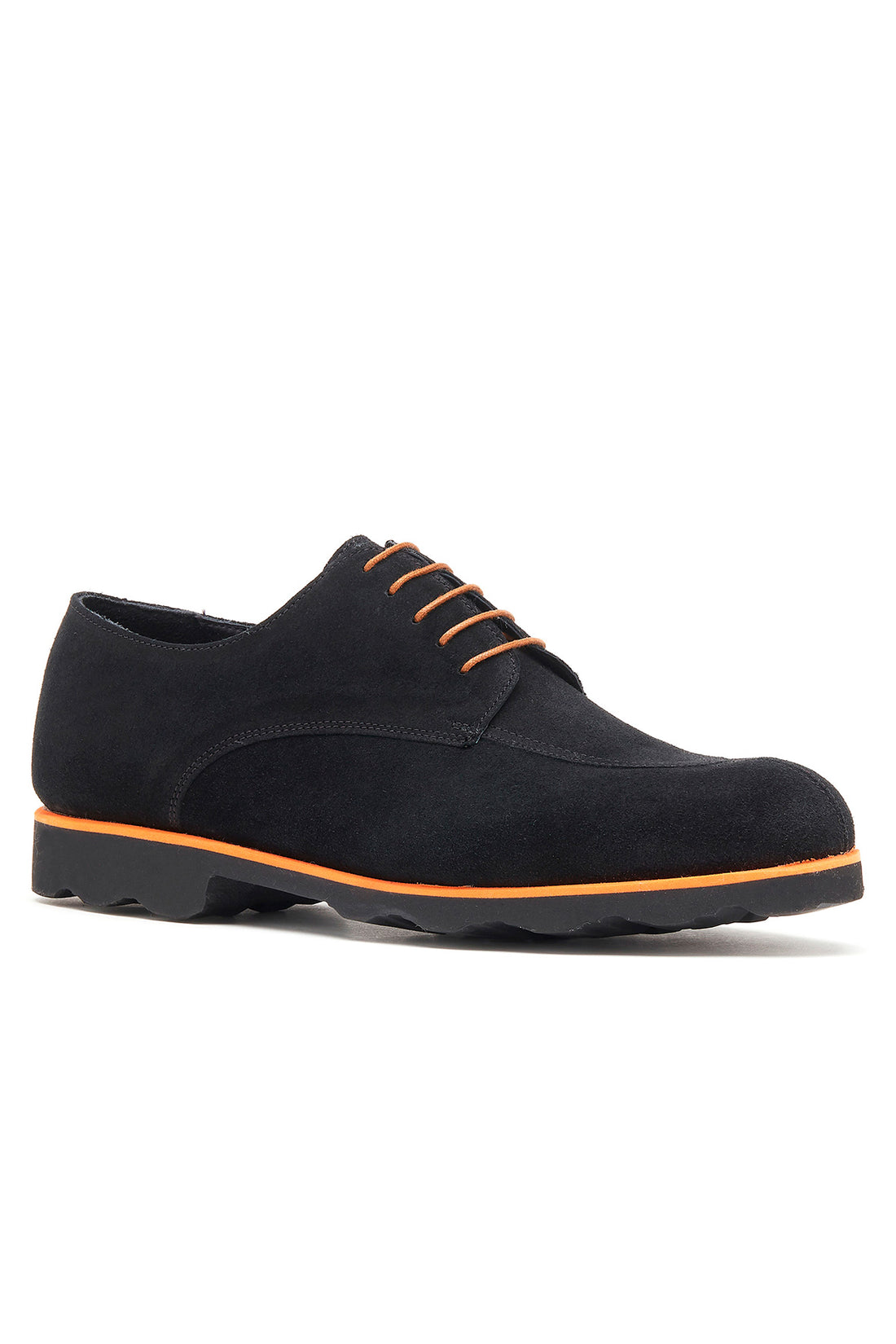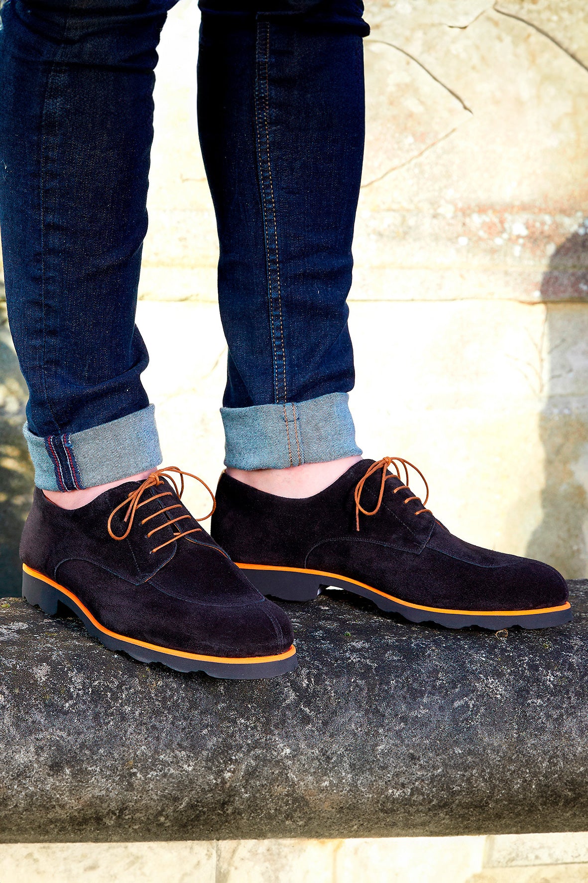 This shoe shape is iconic. This is a hunting cut improved and modernized by Maison Malinge. The orange midsole in contrast with the black upper and sole gives a sporty design to these derbies.