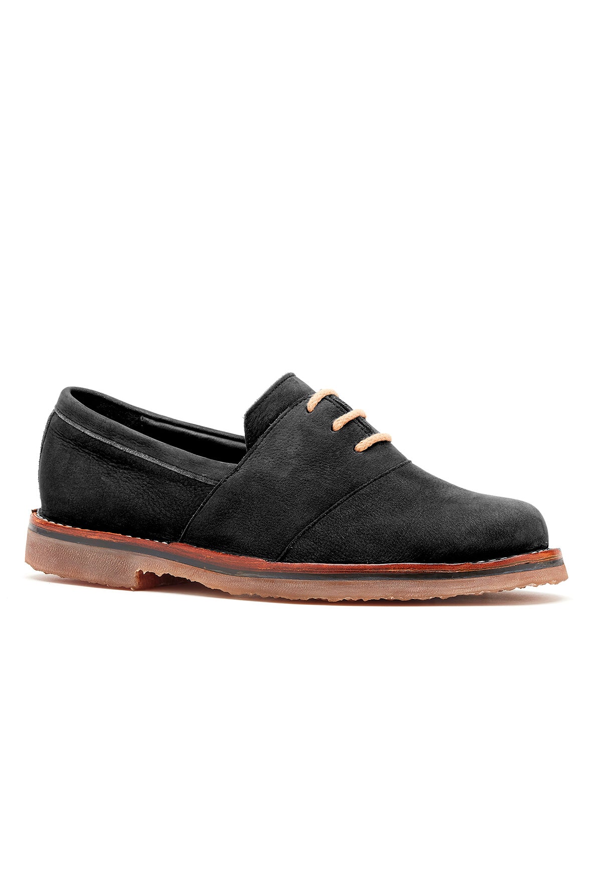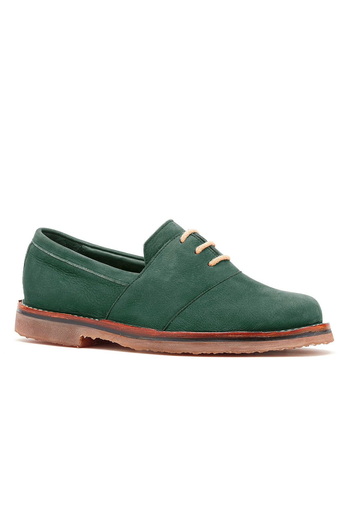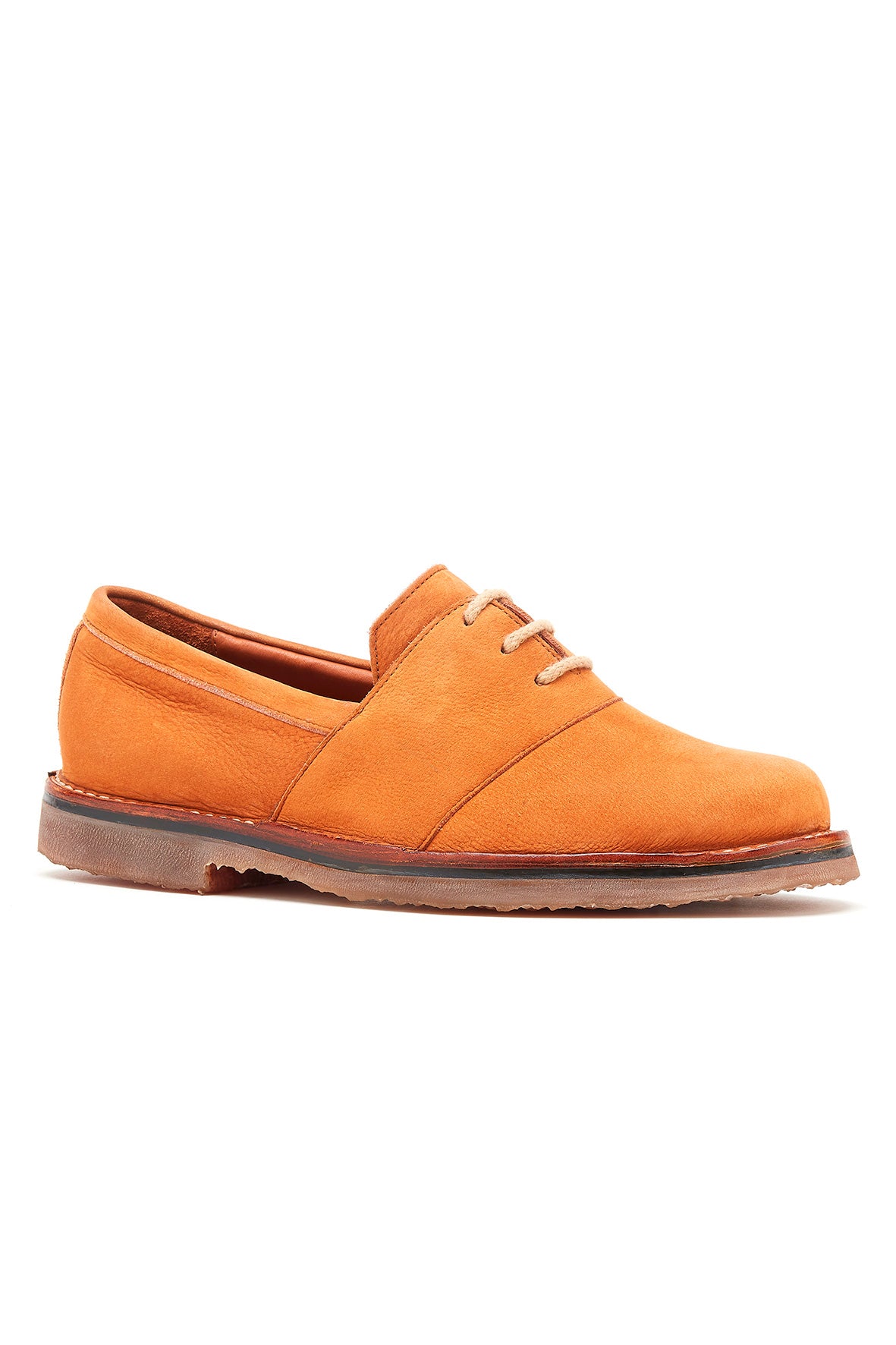 Lactae Hevea ソールとクナイプ ステッチの組み合わせにより、紛れもない柔軟性と快適さを提供します。ヌバックの厚みは、裏地とレザーのトップの間にフォームを入れることで強化されています。このテクニックにより、モデルに丸みのあるデザインと柔らかい着用感が与えられます。