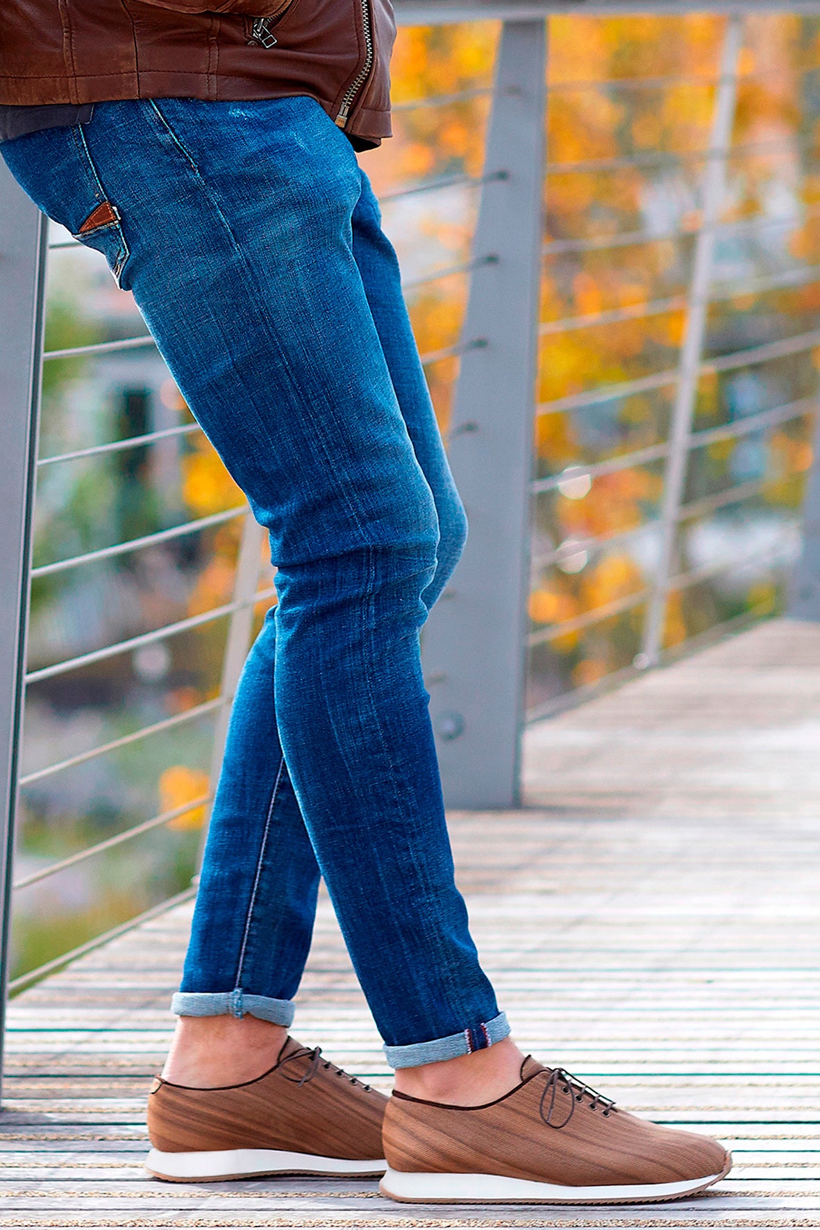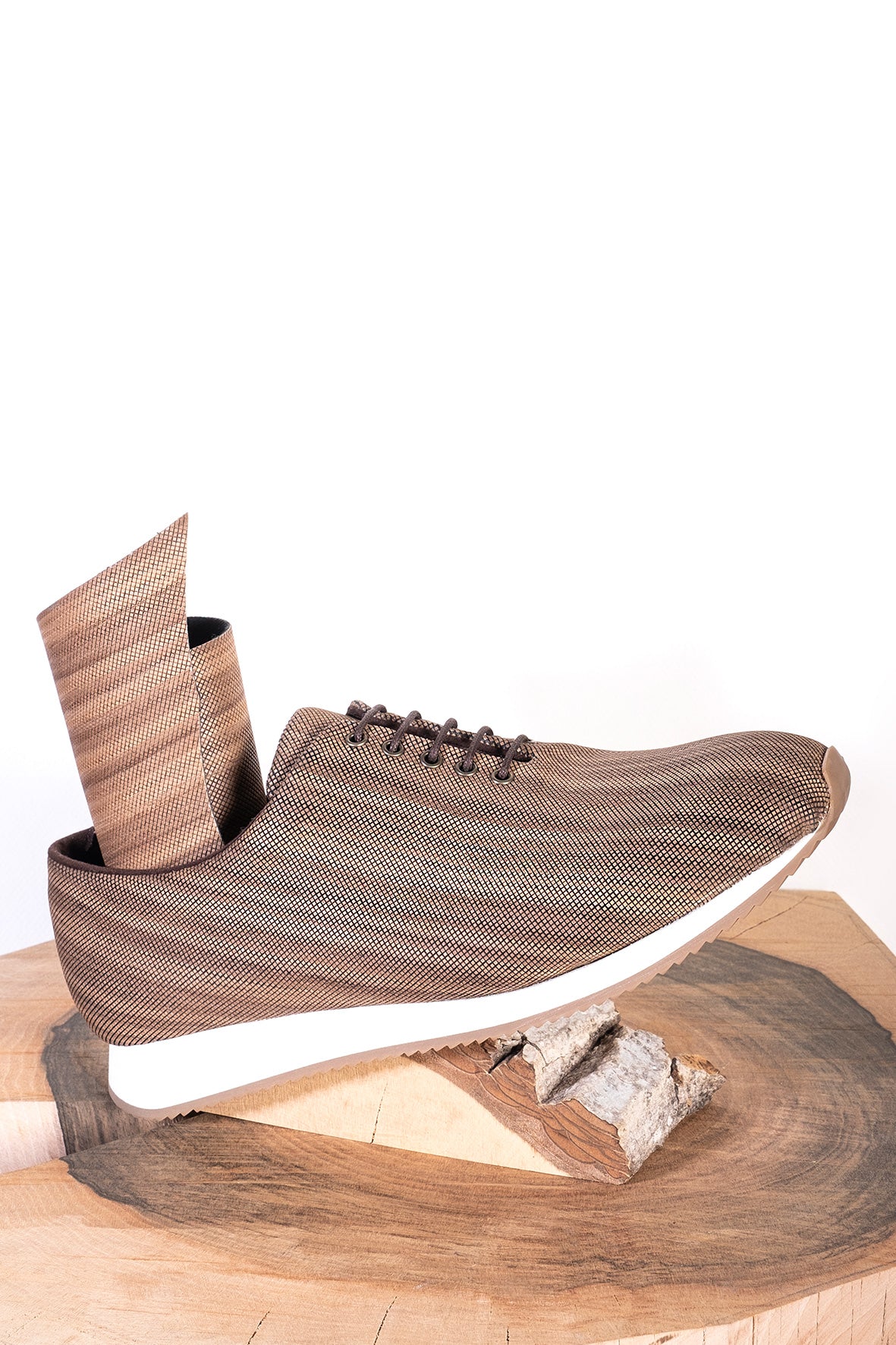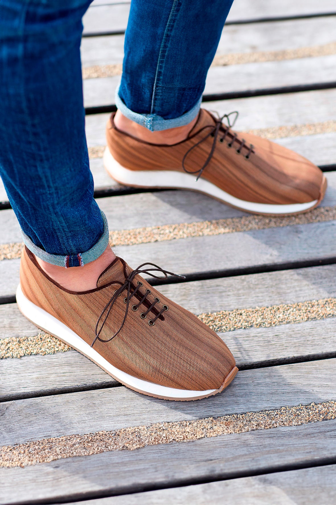 非常に薄い木片に切り込みを入れて柔軟性を持たせます。これらはクルミ材のシートに驚くべき柔軟性をもたらします。これらの切開は、歩行時の足の屈曲や動きに合わせて行われます。また、ソールの素材は地面との接地面で優れたクッション性を約束します。製品の軽量化も実現します。