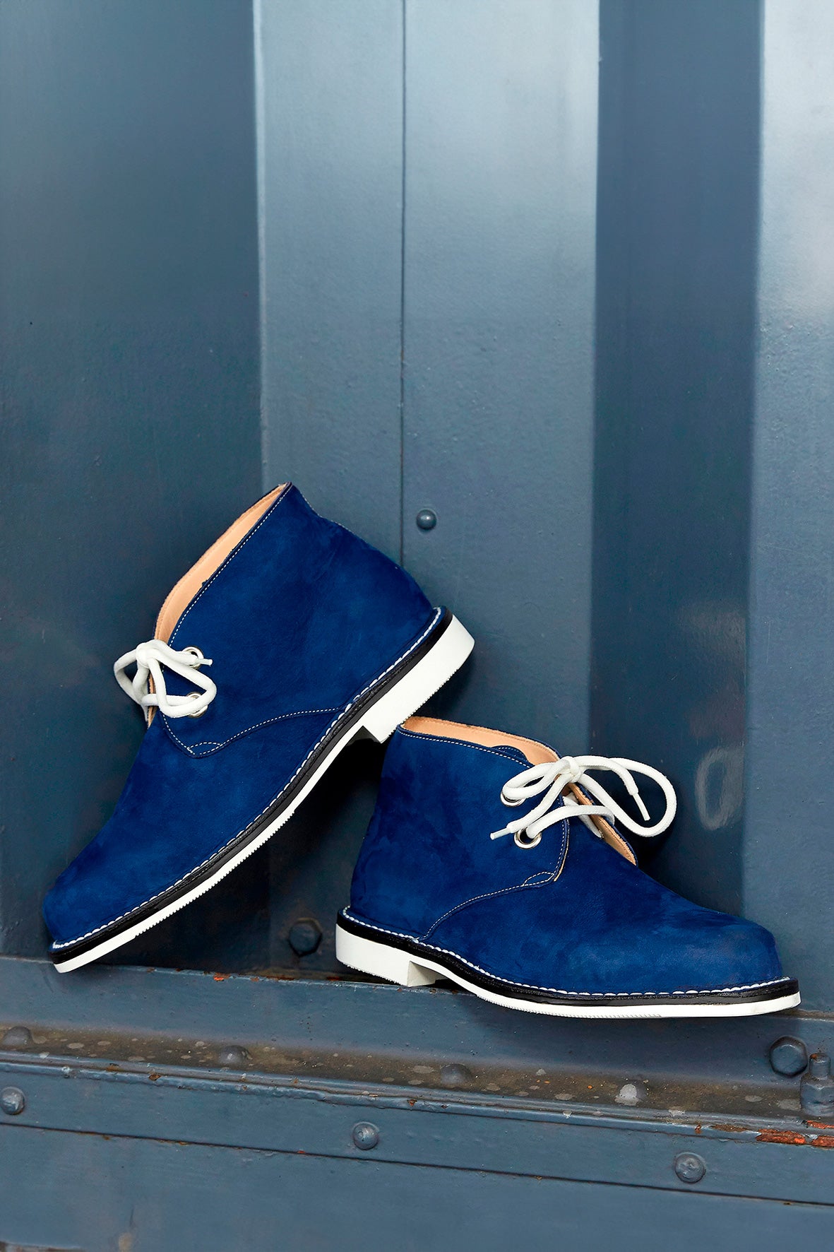 カラーヌバックレザーに白糸、白ソールを組み合わせて春らしい雰囲気に仕上げました。大きなニッケルメッキのアイレットに囲まれた白いシューレースがこの精神を強化しています。