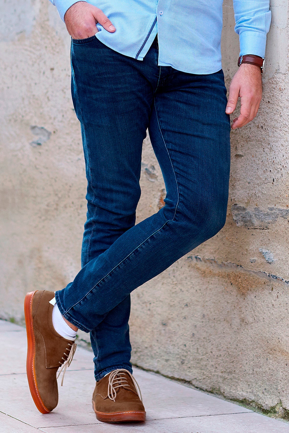 1 — 足を正しく配置する 立った状態で。靴下を履いた強い足 (= 最も長い足) をボール紙の上の壁に置きます。 かかとを壁に押しつけ、足をシートの上に平らに置くようにしてください。 |