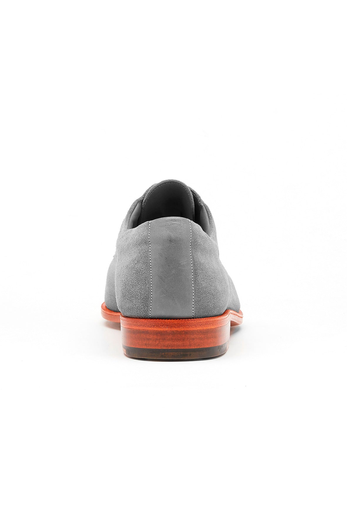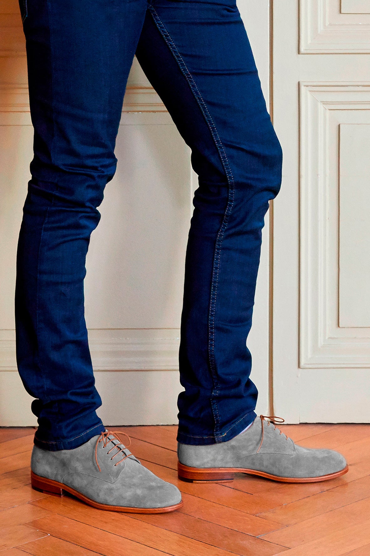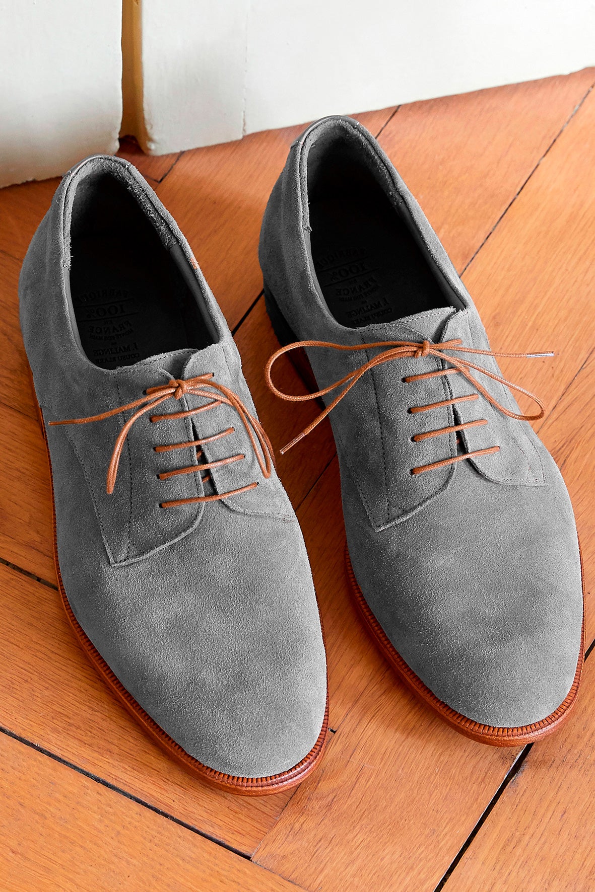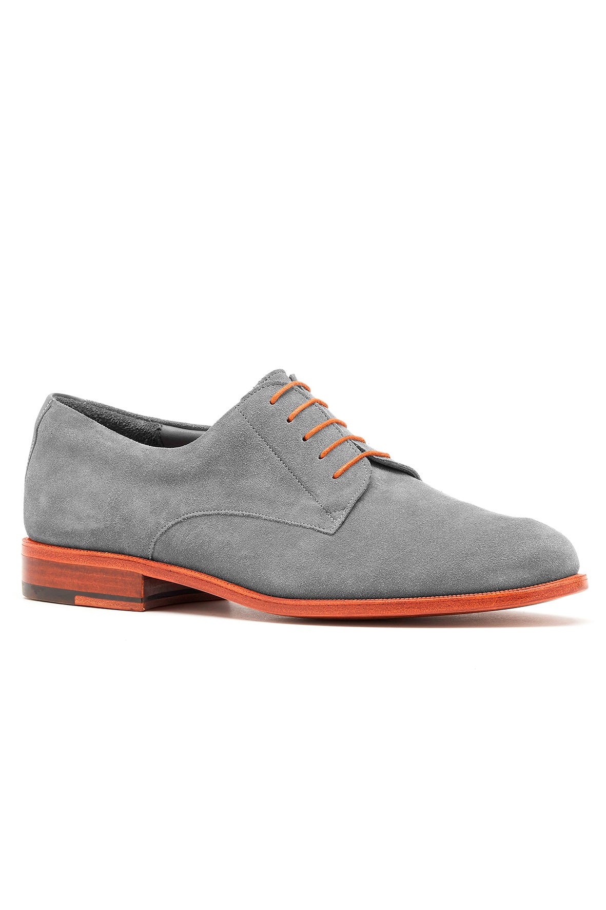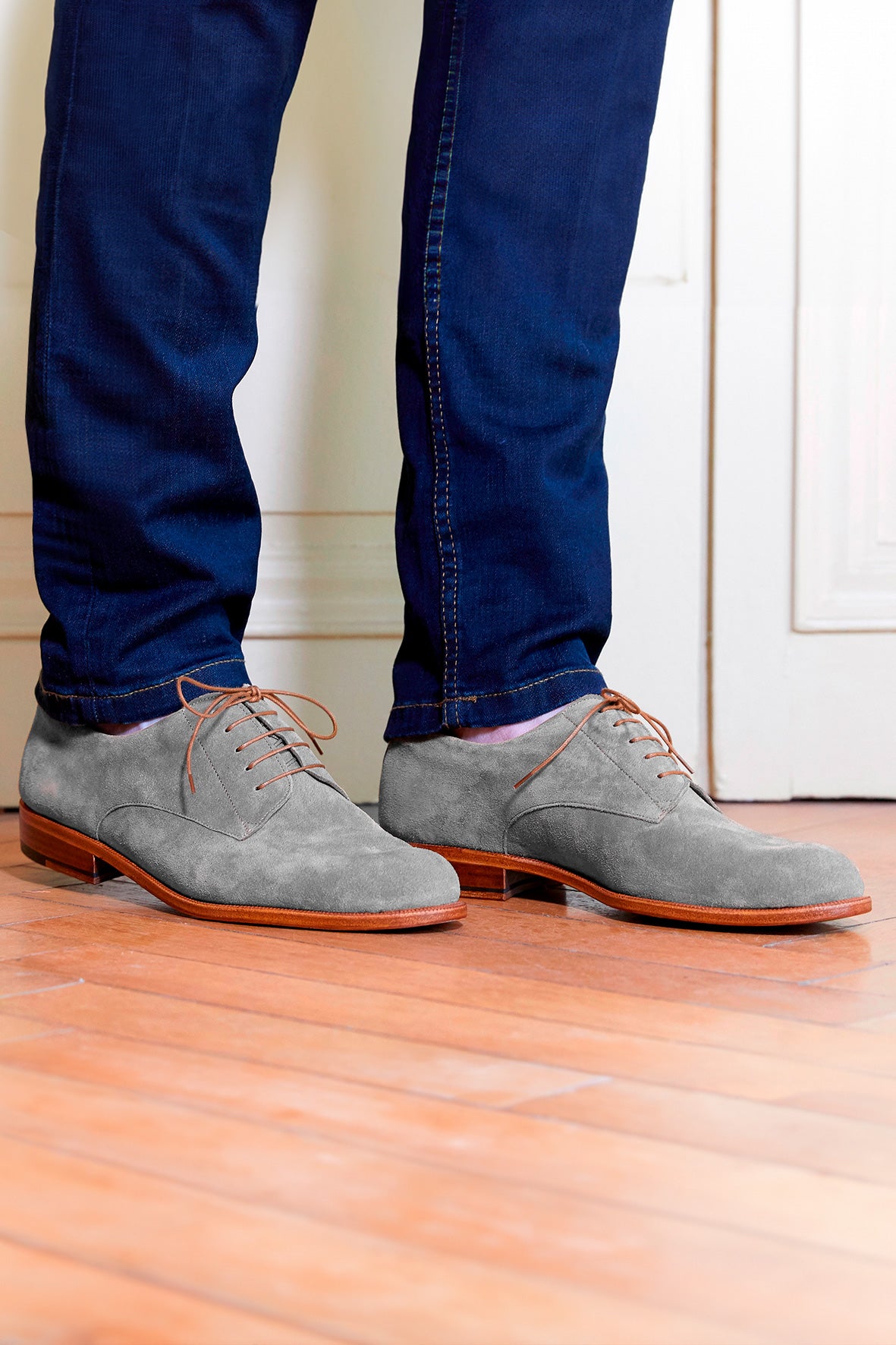 グレーのベロアレザーとハニーカラーのシューレースがコントラストを成し、柔らかく調和のとれたデザインを実現しています。レザーソールとBlake構造は、この丁寧な美学を強化しています。