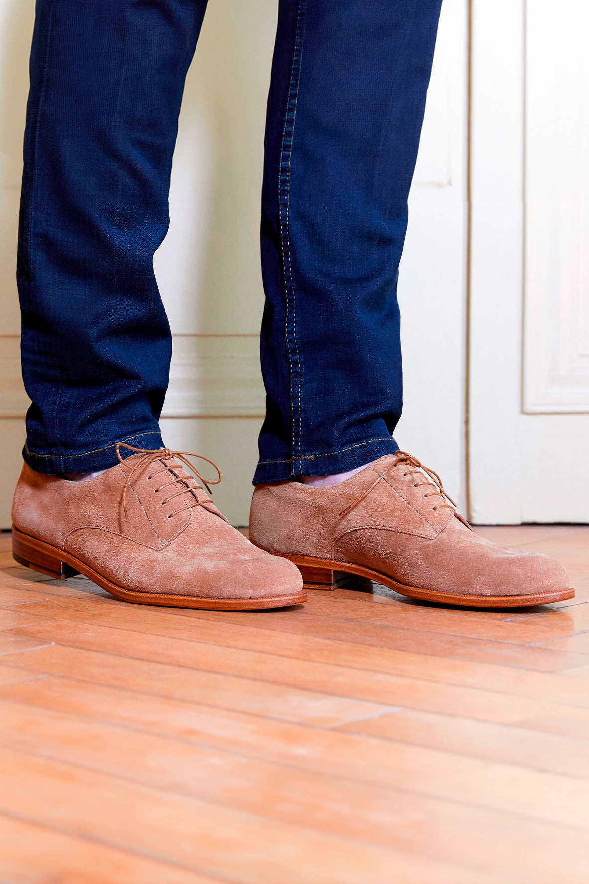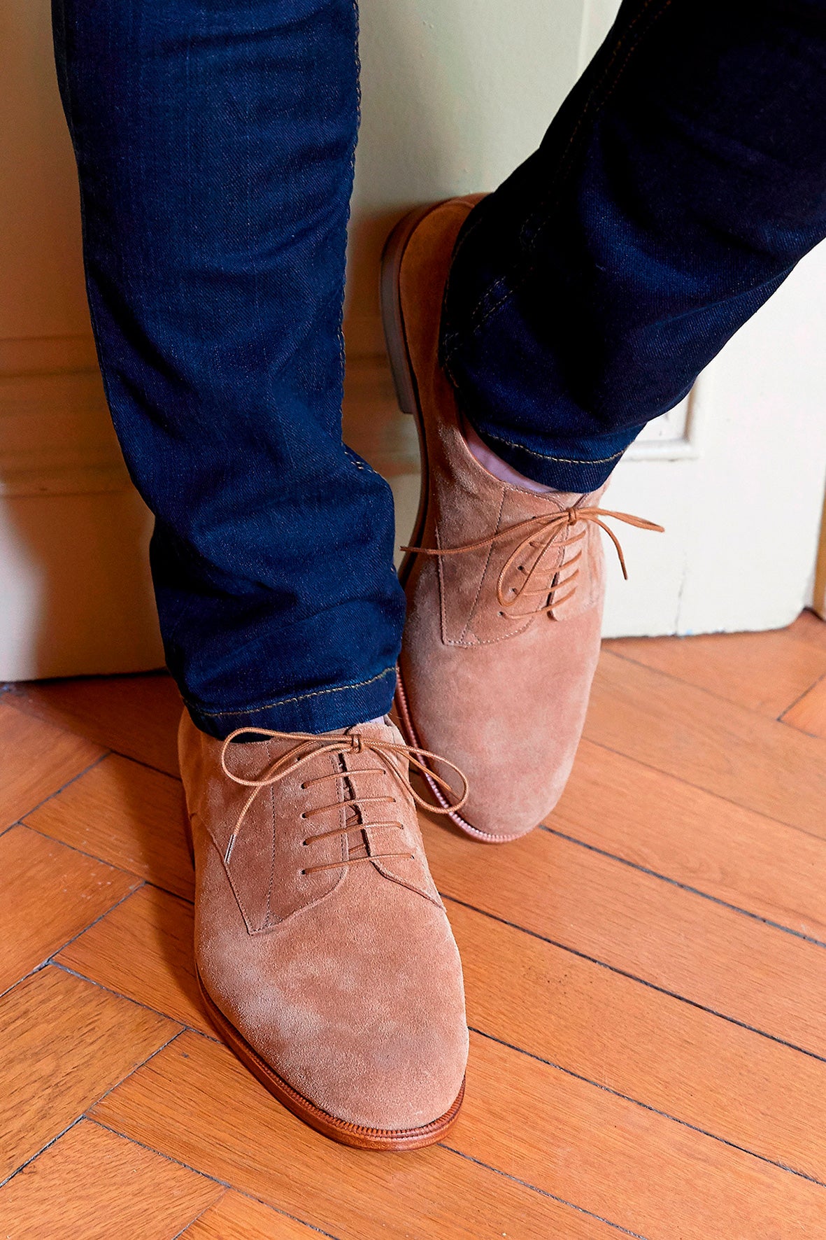ベロアレザーとシューレースはハニーカラーを採用し、柔らかく調和のとれたデザインに仕​​上げました。レザーソールとBlake構造は、この丁寧な美学を強化しています。