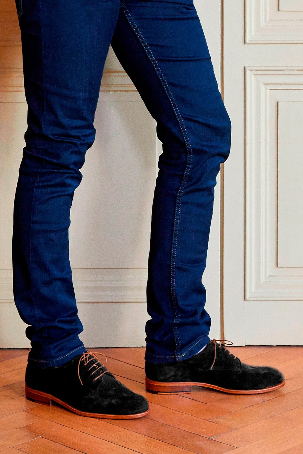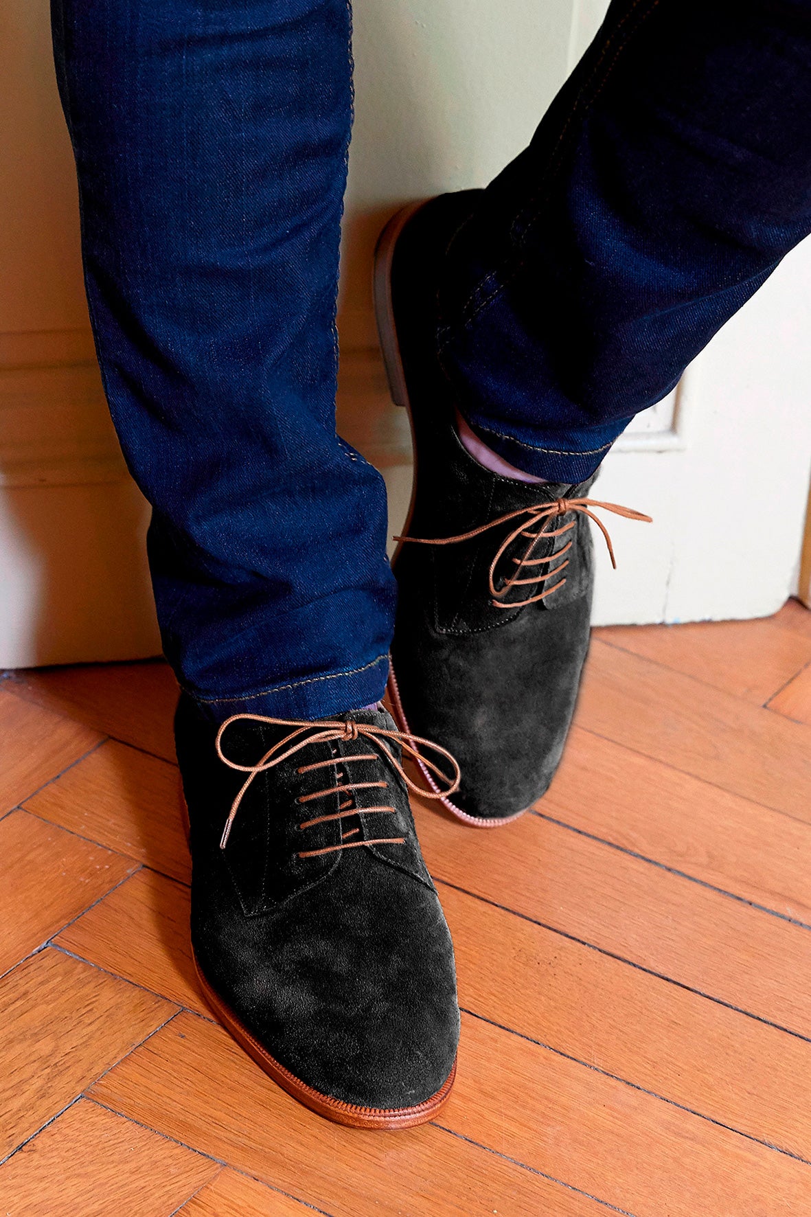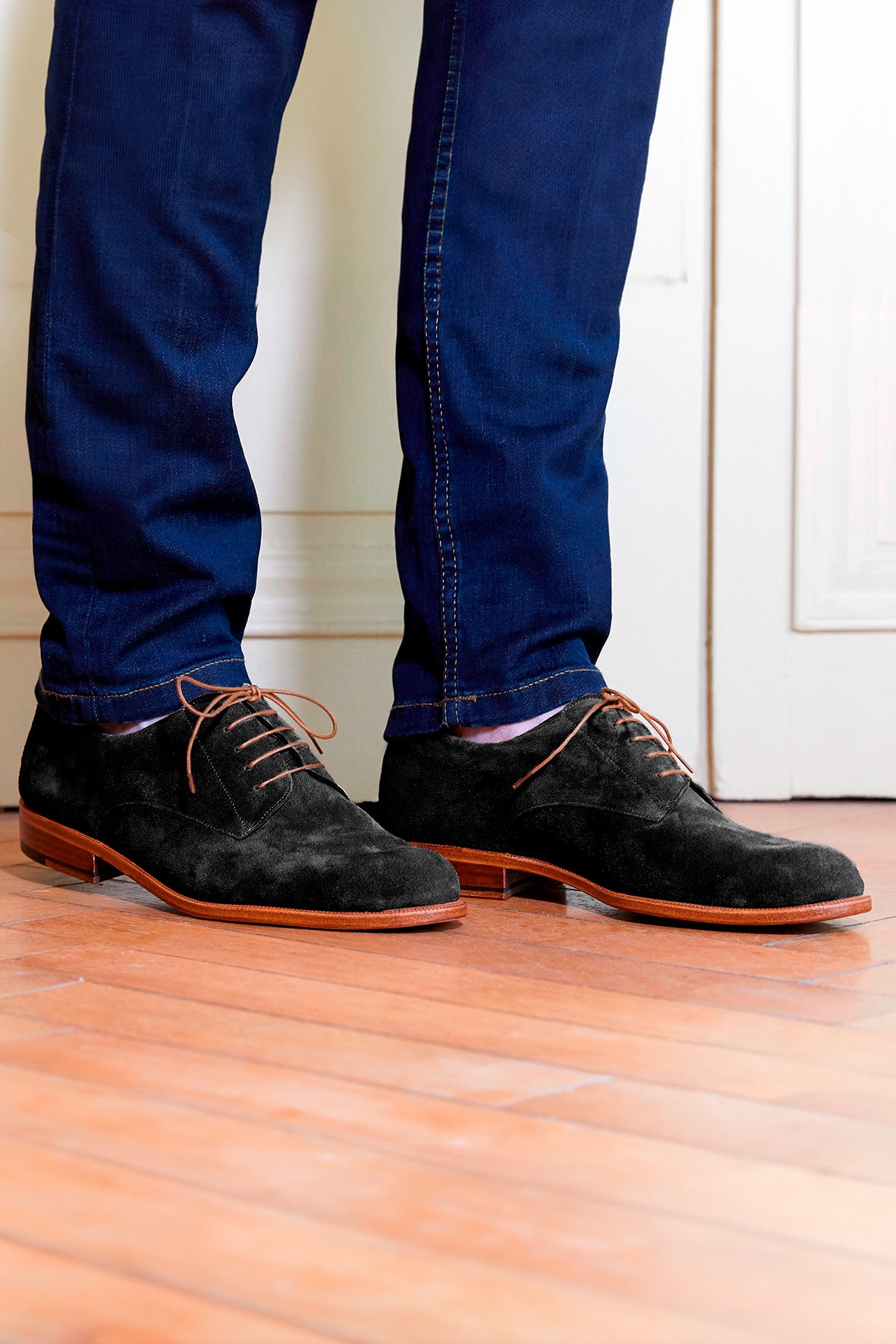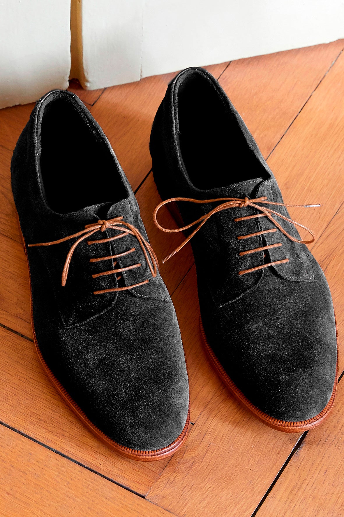 ブラックのベロアレザーとハニーカラーのシューレースのコントラストが、柔らかく調和のとれたデザインを実現しています。レザーソールとBlake構造は、この丁寧な美学を強化しています。
