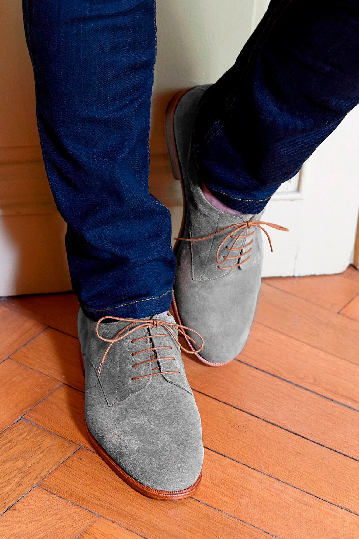 グレーのベロアレザーとハニーカラーのシューレースがコントラストを成し、柔らかく調和のとれたデザインを実現しています。レザーソールとBlake構造は、この丁寧な美学を強化しています。