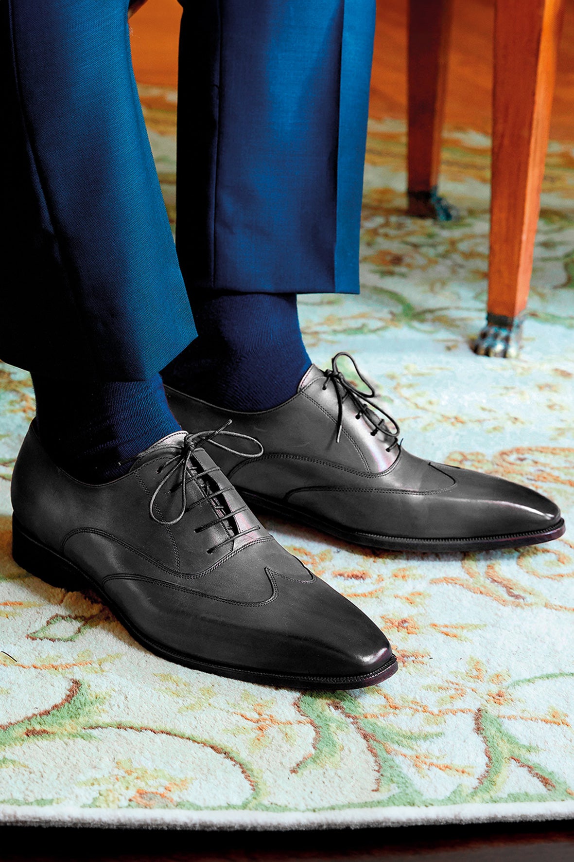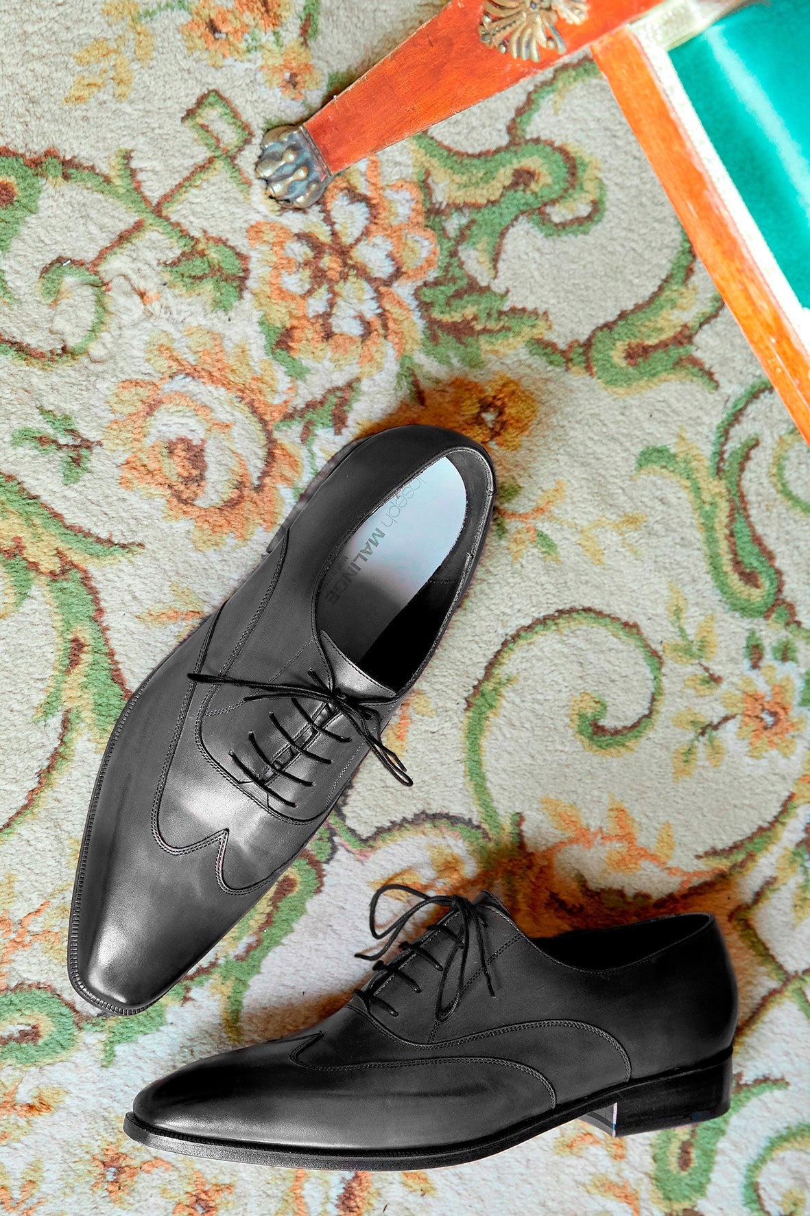 靴のアッパーとレザーソールは工房で手作業でパティーニングされています。同色のシューレースが追加され、すっきりとしたシームレスな仕上がりになっています。