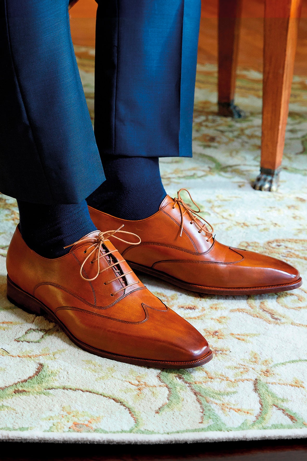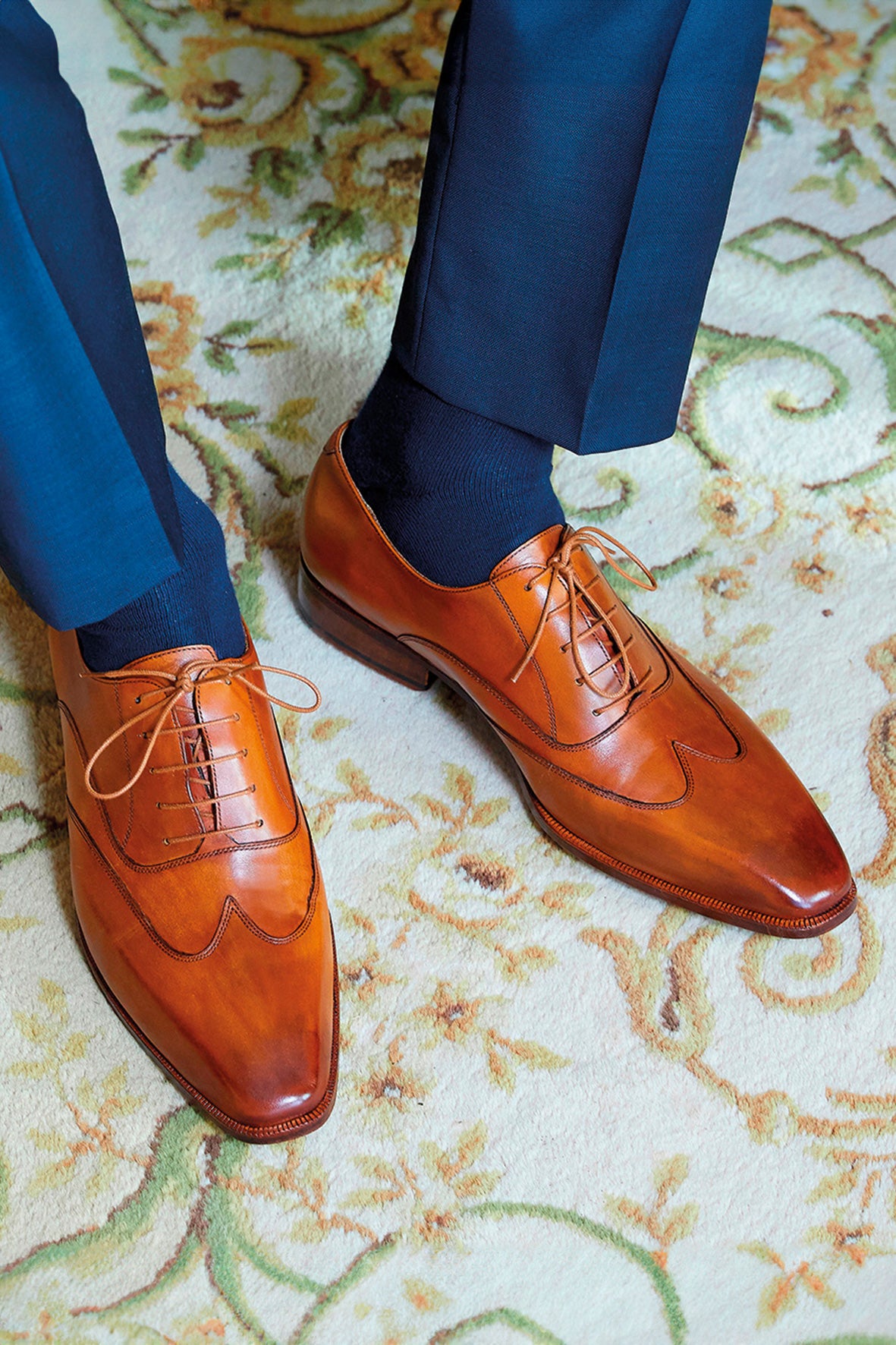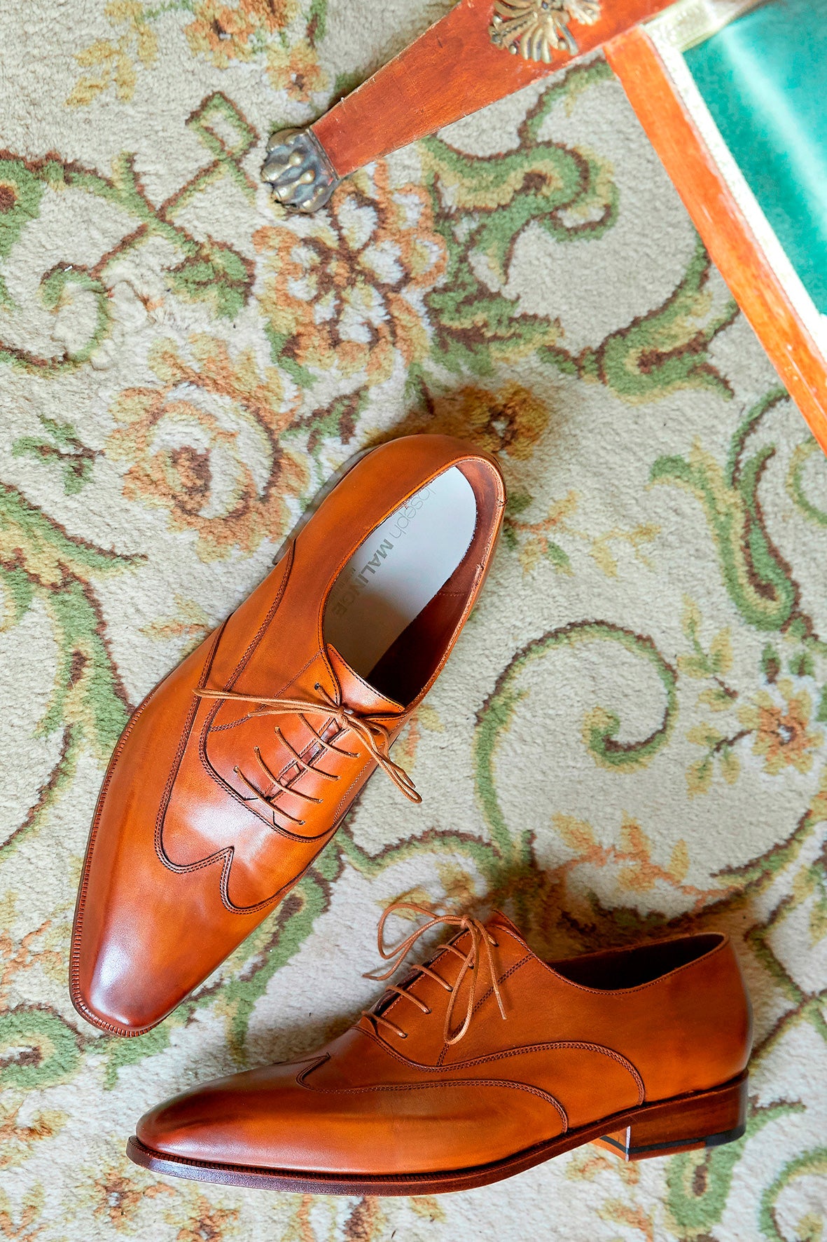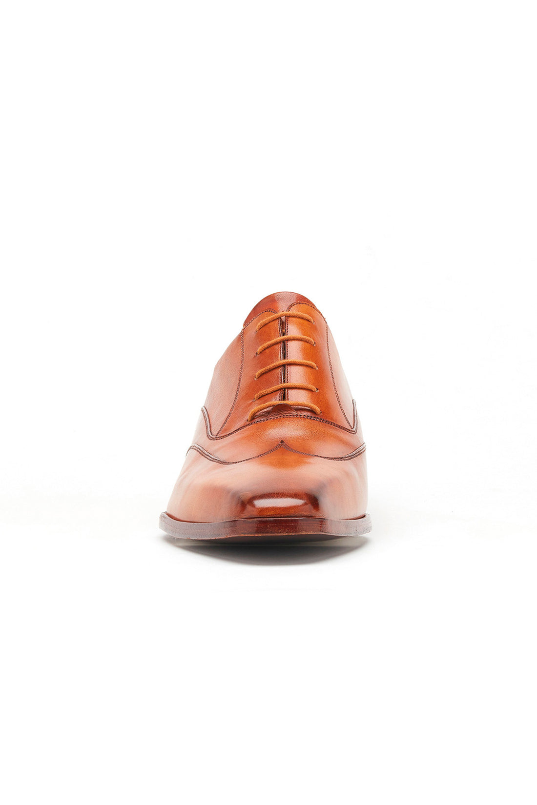 靴のアッパーとレザーソールは工房で手作業でパティーニングされています。同色のシューレースが追加され、すっきりとしたシームレスな仕上がりになっています。