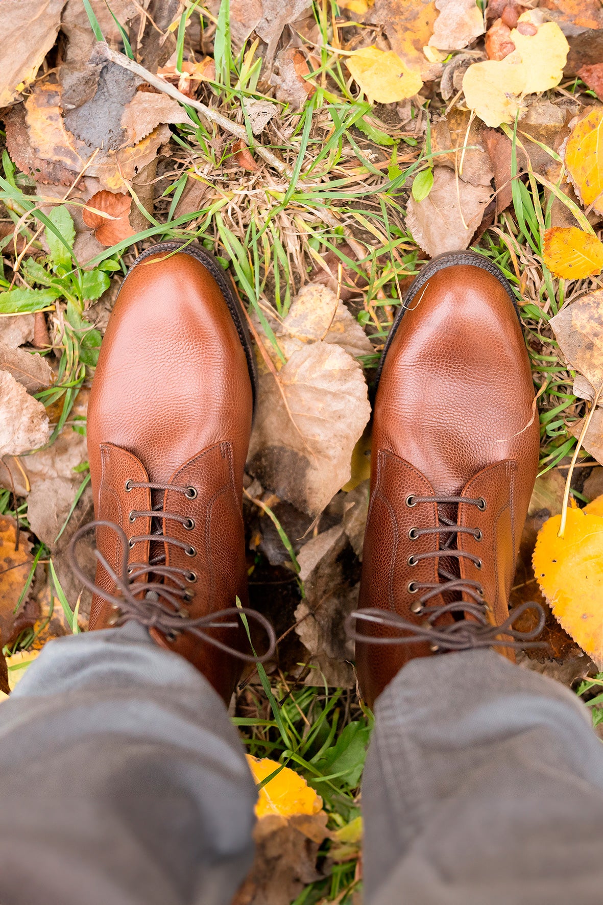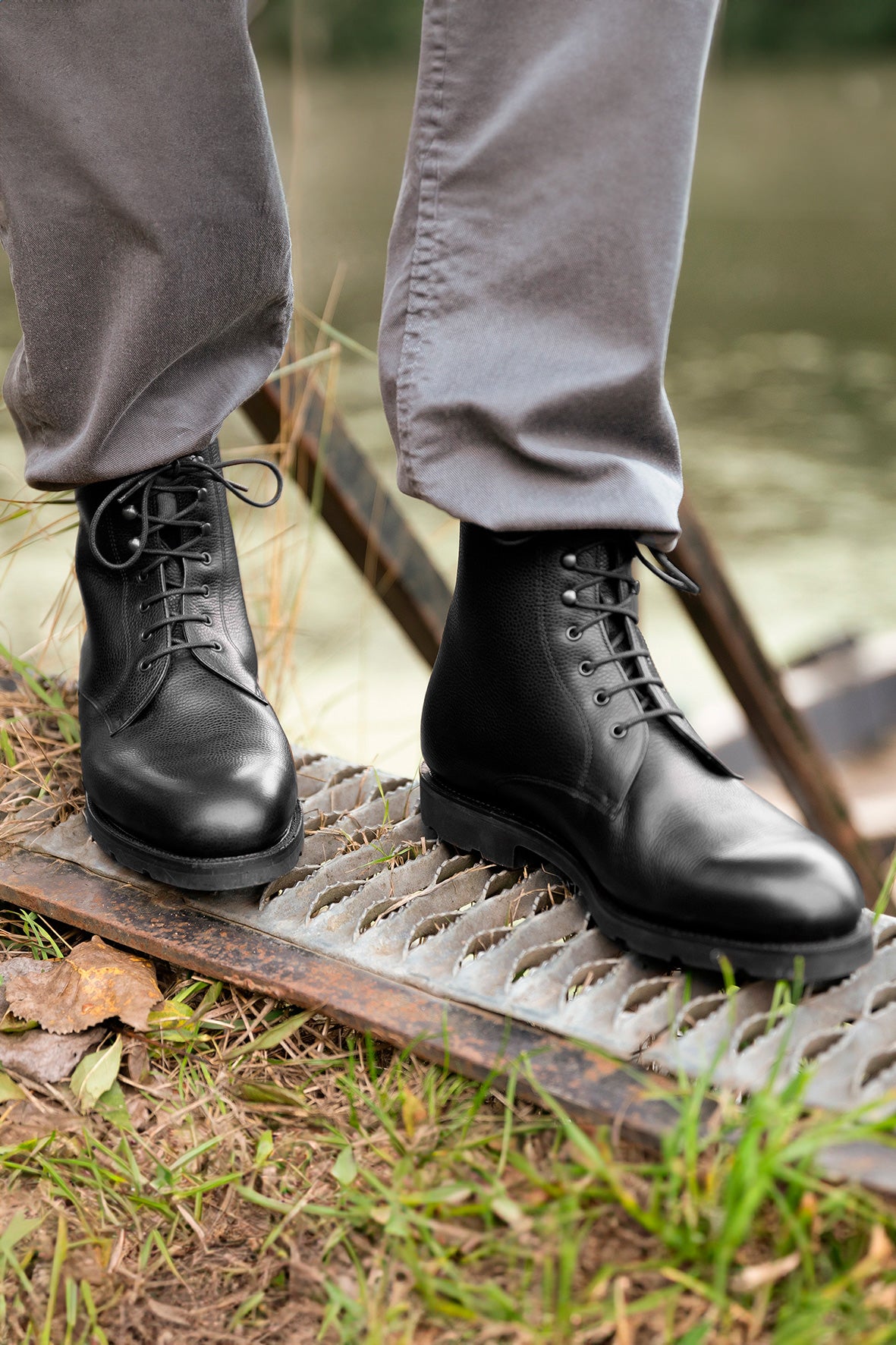 La matière choisie est un cuir grainé qui apporte une touche de modernité à ce modèle. En complément, nous avons réalisé un laçage croisé entre les crochets, qui révèle de la richesse à ces boots.